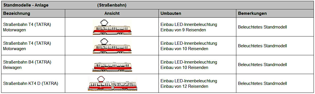 Die aufgeführten Standmodelle sind auf der Eisenbahnanlage fest verdrahtet und angeklebt. die bewegliche Modelle (ohne Motor) sind Rollmodelle. Die meisten Modelle verfügen teilweise über eine LED-Innenbeleuchtung, LED-Scheinwerfer und Reisende und bereichern die Anlage.
