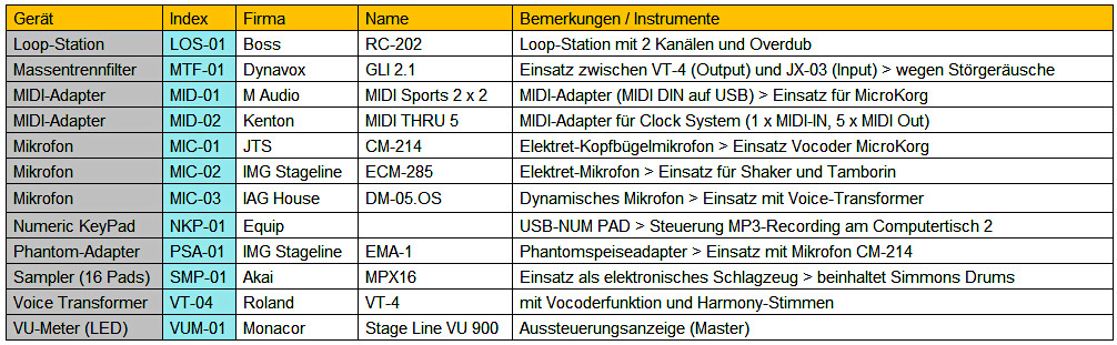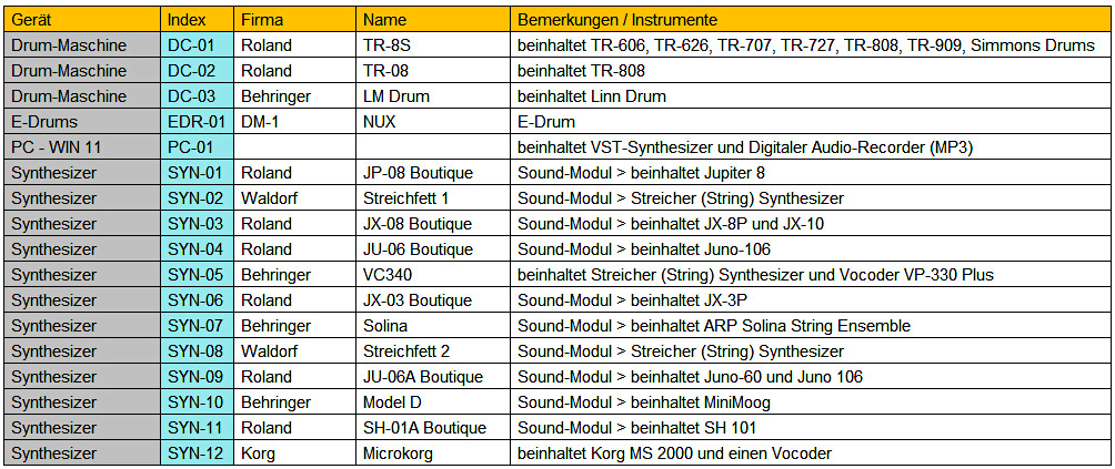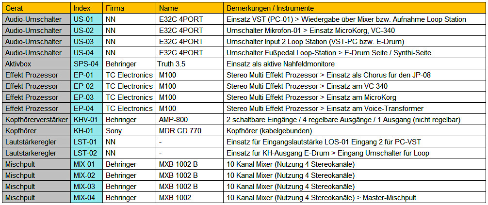 Hier ist die technische Seite des Heimstudios beschrieben. In der Tabelle ist die eingesetzte Technik aufgeschlüsselt.