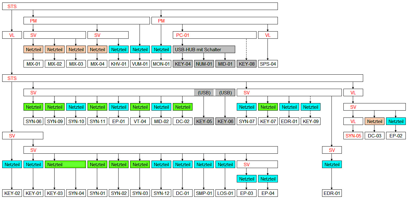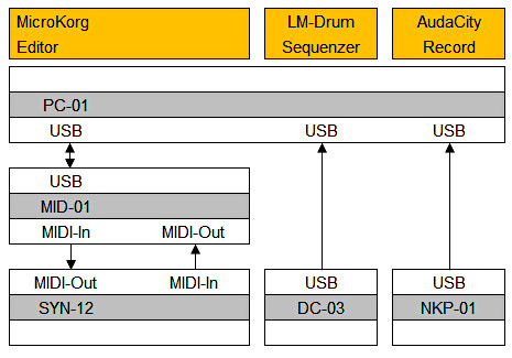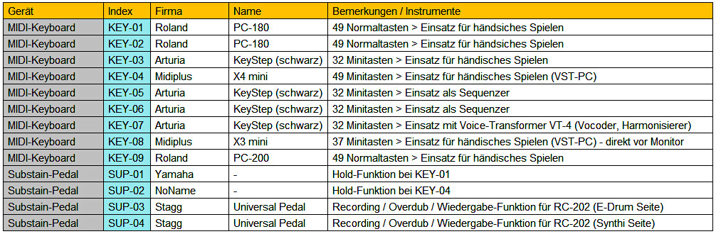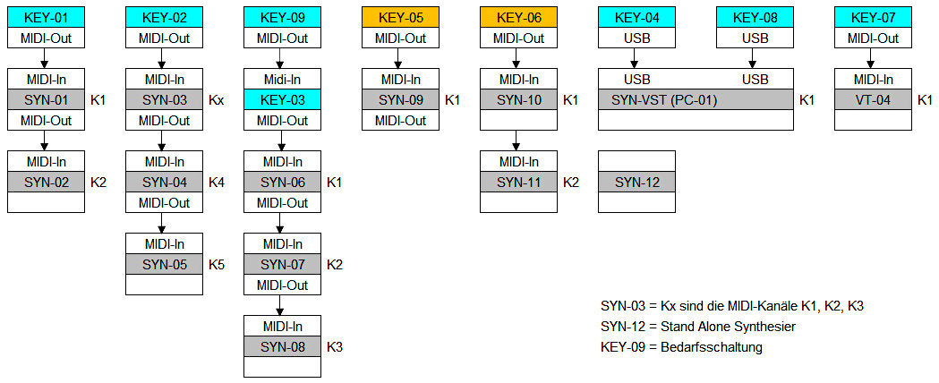 Hier ist die Verschaltung der eingesetzten Geräte dargestellt. Diese Verbindungen dienen zur Steuerung der Synthesizer bzw. Synthesizer-Module über die MIDI-Keyboards per MIDI-DIN. Die Steuerung der VST-Synthesizer erfolgt per MIDI-USB. Die blau hinterlegten MIDI-Keyboards haben 49 Tasten, 37 Tasten bzw. 32 Tasten zum Spielen, die orange hinterlegten MIDI-Keyboards haben 32 Mini-Tasten, einen eingebauten Arpeggiator und einen eingebauten Sequenzer. Die Keyboards KEY-01, KEY-02, KEY-03, KEY-04, KEY-08 und KEY-09 (bei Bedarf) sind für das händische Spielen vorgesehen. Die Keyboards KEY-05, KEY-06 werden mit dem eingebauten Sequenzer bzw. Arpeggiator betrieben. Das KeyBoard KEY-07 dient zur Steuerung des Voice-Transformators VT-4. Der MicroKorg wird Stand-Alone betrieben. Die K-Bezeichnung ist der eingestellte MIDI-Kanal des jeweiligen Gerätes.