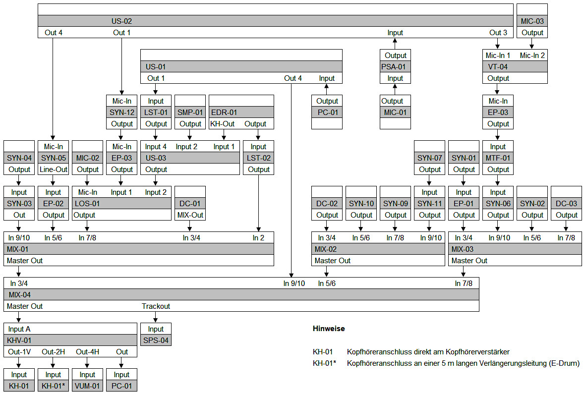 Hier ist die Audio-Verschaltung der Geräte dargestellt (auszugsweise). Alle eingesetzten Geräte sind an 4 Mischpulte (Mono bzw. Stereokanäle) angeschlossen. Die eingesetzten Mischpulte haben pro Kanal einen Höhen-Regler, einen Mitten-Regler, einen Bass-Regler, einen Balance-Regler und einen Gain-Regler (Eingangslautstärke). Gleichzeitig fungiert das vierte Mischpult noch als Master-Mischpult. Der Kopfhörerverstärker (KHV-01 hat vier regelbare (Out-R) und einen ungeregelten Ausgang (Out).