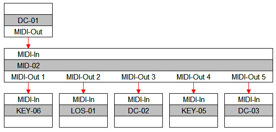 Verschaltung der verschiedenen Geräte mittels MIDI-Verbindungen