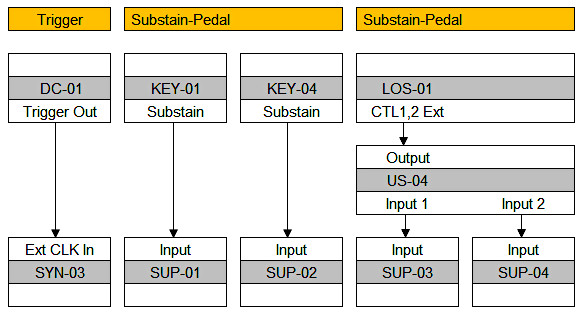 An den Keyboard KEY-01 und KEY-04 sind Substain-Pedale angeschlossen. An der Loop Station (LOS-01) sind ebenfalls 2 Substain-Pedale angeschlossen, diese dienen hier aber als Aufnahme-Start und Aufnahme-Stop.